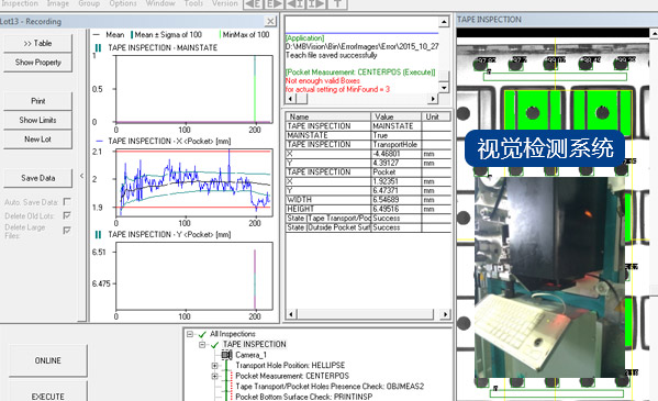 CT8/24设备自带的视觉检测系统,主要检测尺寸:A0、B0、P2、F,同时还可检测载带表面及底部是否存在不良等问题。具有准确度高、稳定性强、误报率低等特性。